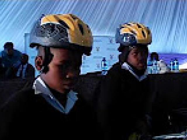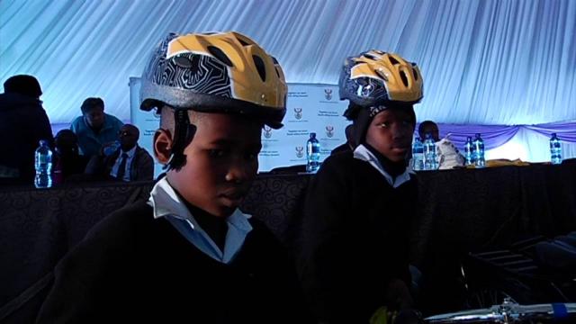 Deputy Minister Ndabeni Abrahams hands over bicycles to Hlophe High and Remington Primary school