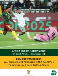“Bafana Bafana bow out of AFCON after a hard-fought match against Cameroon. We salute the team for their effort and commitment, and thank South Africans for the unwavering support,” said government.