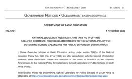 The Department of Basic Education (DBE) has published proposed amendments to the School Calendar Policy aimed at strengthening national coherence, simplifying implementation, and ensuring a streamlined framework for determining school term dates across all nine provinces.