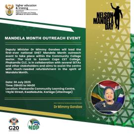 Higher Education and Training Deputy Minister, Dr Mimmy Gondwe, will visit the Phakamile Community Learning Centre (CLC) in Kariega, near Gqeberha, as part of the department’s Mandela Month outreach programme.