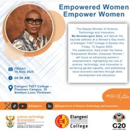 The Deputy Minister of Science, Technology and Innovation, Nomalungelo Gina, will speak at a Women’s Day event at the Elangeni Technical and Vocational Education and Training (TVET) College in Durban, on Friday.