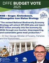 “South Africa’s biodiversity is a powerful engine for development. The revised National Biodiversity Economy Strategy will unlock 397,000 jobs and inject R127 billion annually into the economy by 2036 through eco-tourism, bioprospecting, and sustainable game meat production.
