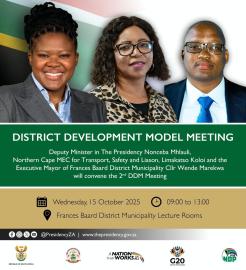As part of government’s ongoing efforts to strengthen coordination and alignment between the three spheres of government, Deputy Minister in The Presidency, Nonceba Mhlauli will convene the Second District Development Model (DDM) Meeting in the Northern Cape.