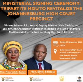 Justice and Constitutional Development Minister Mmamoloko Kubayi and Public Works and Infrastructure Deputy Minister, Sihle Zikalala, will today sign a Tripartite Memorandum of Understanding (MoU) together with Jozi My Jozi NPC to revitalise the Johannesburg High Court precinct.