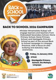 Minister of Justice and Constitutional Development, Mmamoloko Kubayi, is expected to engage learners and teachers as part of the annual Back-to-School campaign, with a focus on anti-bullying and statutory rape awareness.