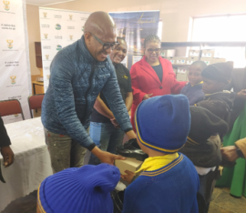 From Tlapeng village, the Deputy Minister proceeded to Anvonster informal settlement, where he handed over school shoes to learners. From there, he proceeded to Mmabana Cultural Centre, where he also handed over school shoes to learners from different schools.