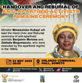 Department of Justice and Constitutional Development (DJCOD) Minister Mmamoloko Kubayi will, on Saturday, preside over the handover and reburial ceremony of the exhumed remains of political activists who were hanged on death row for politically related offences.