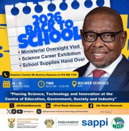 As part of his District Development Model (DDM) mandate, Minister of Science, Technology, and Innovation, Professor Blade Nzimande, will conduct an oversight visit to four schools in KwaZulu-Natal on 14 and 15 January 2026.