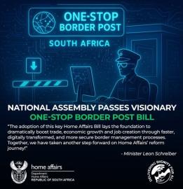 Home Affairs Minister Leon Shreiber says tabling of the One-Stop Border Post Bill before the National Assembly serves as a testament to the Government of National Unity’s commitment to intensify its work to generate economic growth and combat unemployment.