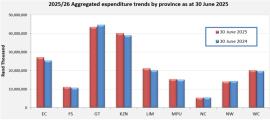 Aggregate spending on goods and services is R41.3 billion or 25.2 per cent of the R163.7 billion main budget. This is 2.5 per cent or R1.1 billion lower compared to the same period in 2024/25, reflecting tighter control in this category of spending.