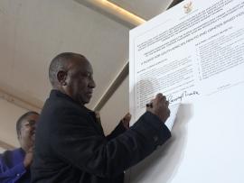 President Ramaphosa, joined by Northern Cape Premier Dr Zamani Saul and other government officials, signed a pledge for South African men to end gender-based violence and femicide during the national Women’s Day commemoration at the Denis Nel Stadium in Pofadder.