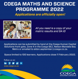 The Coega Development Corporation (CDC) has called on 2021 matric pupils from previously disadvantaged backgrounds who would like to improve their mathematics and science results to enrol in its programme.