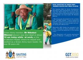 Gauteng MEC for Social Development, Agriculture, Rural Development and the Environment, Mbali Hlophe has expressed deep grief at the passing of a worker that was fatally shot while on duty at Jabulani Hostel in Johannesburg.
