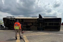"In an attempt to avoid a collision, the bus driver also braked and swerved, resulting in the bus losing control, rotating clockwise, overturning, and coming to a rest in the off-ramp lane, facing south," Zwane said.