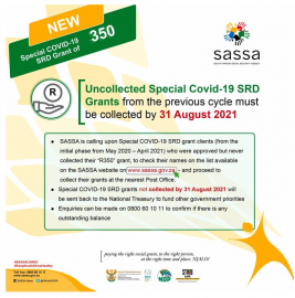 The South African Social Security Agency (SASSA) has called on applicants of the Special COVID-19 Social Relief of Distress (SRD) grant, who did not collect their R350 grant from the previous cycle, to do so before 31 August 2021.