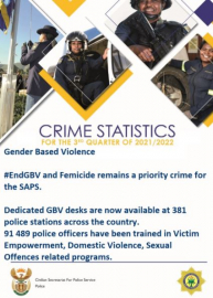 Presenting the quarterly crime statistics for the period from 01 October 2021 to 31 December 2021, Cele reiterated that GBV and Femicide (GBVF) remains a priority crime for the South African Police Services (SAPS).