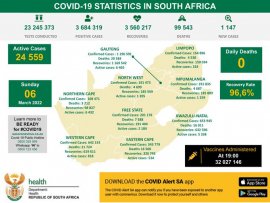 “Due to the ongoing audit exercise by the National Department of Health (NDoH), there may be a backlog of COVID-19 mortality cases reported. Today, the NDoH reports zero deaths, as well as zero deaths occurring in the past 24 – 48 hours.