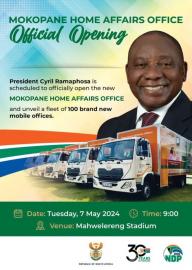On Tuesday, 07 May, President Cyril Ramaphosa will officially open a new, purpose-built Department of Home Affairs office in Mokopane, Limpopo, and unveil 100 new mobile offices that will extend the reach of the department’s services, especially in remote areas.
