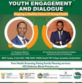 On Tuesday, 16 April, the Deputy Minister of Health together with the Deputy Minister of Higher Education, Science and Innovation will interact with young people in KwaZulu-Natal as part of ongoing youth engagements and dialogues to tackle health-related challenges facing young people with potential to affect their academic journey.