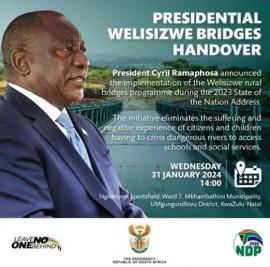 Also on Wednesday, 31 January, President Cyril Ramaphosa will undertake a Presidential Welisizwe Bridges hand over in KwaZulu-Natal.