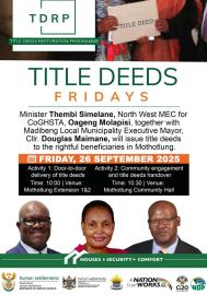 Human Settlements Minister Thembi Simelane and the North West MEC for Cooperative Governance, Human Settlements and Traditional Affairs, Gaoage Oageng Molapisi, will on Friday hand over 397 title deeds to their rightful owners in Mothotlung.