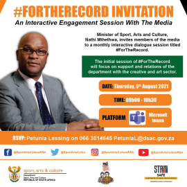 Addressing a live engagement session with the media on the support provided to the creative and arts sector, the Minister recognised Olympic champion and world record holder, Tatjana Schoenmaker, as well as surfer Bianca Buitendag for their stellar performance at the Olympic Games in Tokyo.