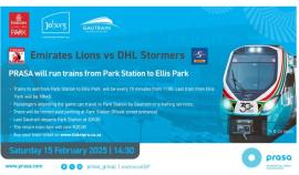 The Passenger Rail Agency of South Africa (PRASA) has announced a train service for the Emirates Lions vs DHL Stormers rugby game taking place this weekend at the Emirates Airline Park (Ellis Park Stadium) in Johannesburg.