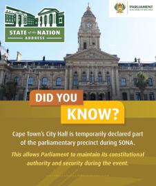 During this sitting, to be held at the Cape Town City Hall, the President will deliver the first State of the Nation Address (SONA) of the seventh democratic Parliament.