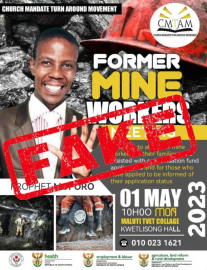 In a statement on Saturday, Government noted with concern a misleading digital poster circulating on social media platforms bearing the face of Prophet Moporo, inviting all former mine workers and their families to be assisted with compensation fund applications, and also inform those who have applied of their application status.