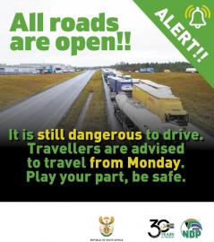 Government has announced that all roads affected by the recent snowstorm, including the N3 Toll Route, have now been reopened to traffic.