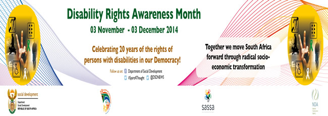 The 2014 National Disability Rights Awareness Month takes place within the broader context of our Twenty Years of Democracy celebrations, the International Day of Persons with Disabilities on December 3, and the finalisation of the Post 2015 Development Agenda internationally, among others. Activities during the Month will
